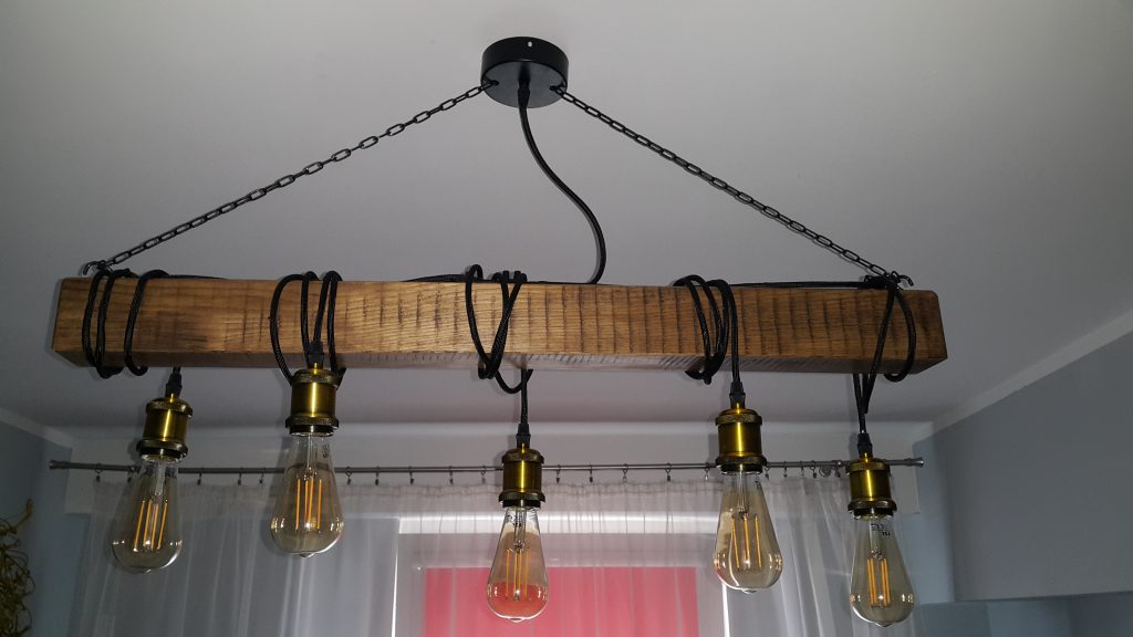 Piękny rustykalny żyrandol świeżo wykonany w Olsztynie. Drewniana belka starannie wykończona i pomalowana lakierem do mebli V33. Zawieszony na dekoracyjnym, czarnym metalowym łańcuszku.